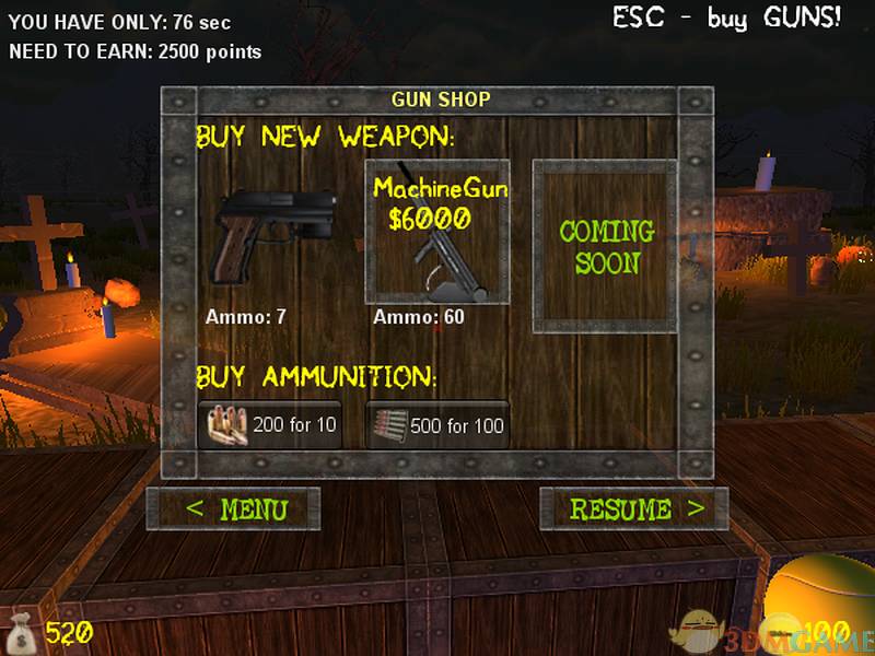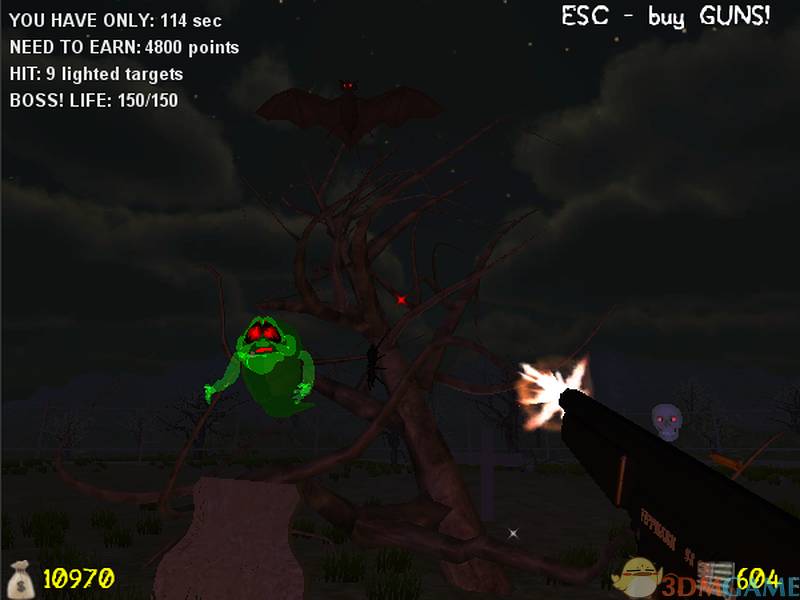 这是一款万圣节主题的射击游戏,游戏中你在一个三维的场景中和万圣节的鬼怪们战斗,你必须在不同的地点,从洞穴到城堡执行任务,最初你的敌人将是南瓜和蝙蝠,不过后面就要面对鬼怪和BOSS的战斗了。杀死怪物可以获得金钱,你可以用金钱来购买新的武器和弹药。