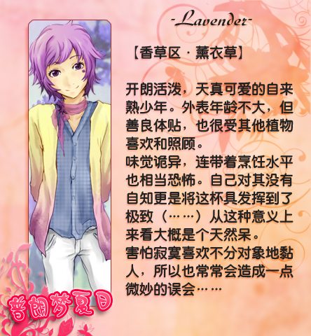 游戏的女主角廖扬(游戏中可由玩家自行改名)受朋友Julie所托,在她准备婚礼期间从她的私家贵族花园——普朗花园里,领走一种植物来给婚礼腾出场地,并代为照顾,为期8个星期。为方便照料,植物在Julie的授意下以人形出现。和这样的植物少年/青年在一起相处的近两个月里,发生了一些事情,也微微地影响了女主角对这样的他们的感情与想法……