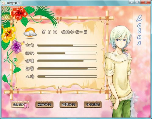 游戏里总共有酷暑、晴天、多云和雨天四种天气。水分的消耗依次递减,而肥料和健康度的消耗会依次递增。按照不同的天气来安排养育计划对增加植物另外两个重要参数“能量”与“人格”而言是很重要的。