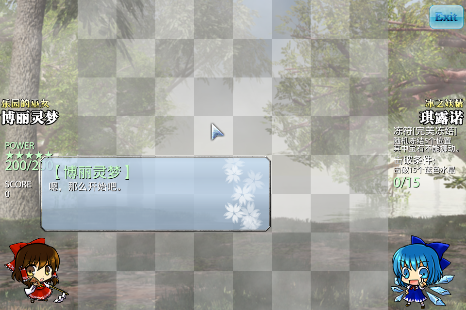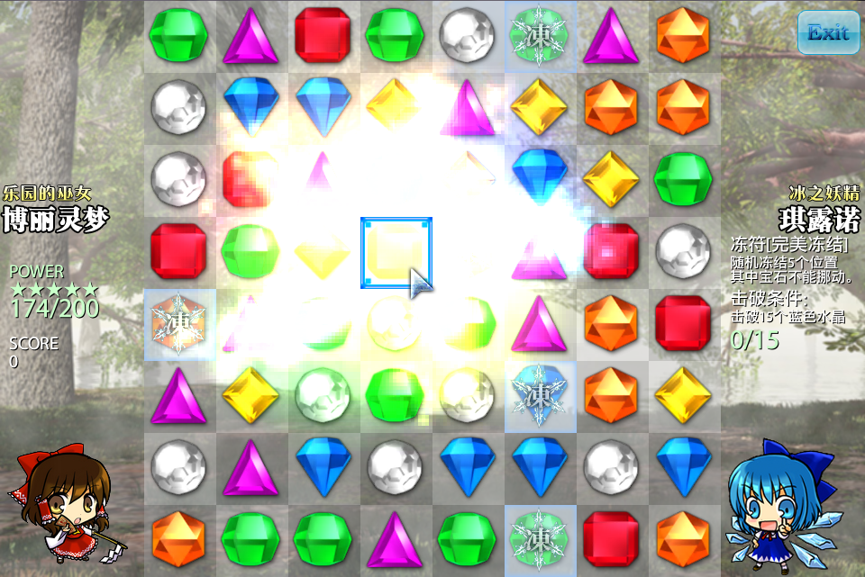 简中《东方水晶乡》是由游戏制作者⑨ & liqunsz制作并于2011年7月15日发行在PC平台上的一款益智类游戏,类似传统的钻石消除游戏,但是全新的符卡系统和过关挑战会带给玩家全新的体验。