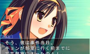 游戏讲述的是围绕着凉宫春日熟悉的角色所发生的三起案件,玩家需要扮演不同角色,在侦探模式中搜索证据,并在法庭上运用这些证据找出真正的犯人,游戏系统基本与《逆转裁判》相同。