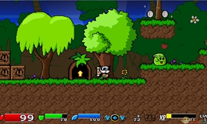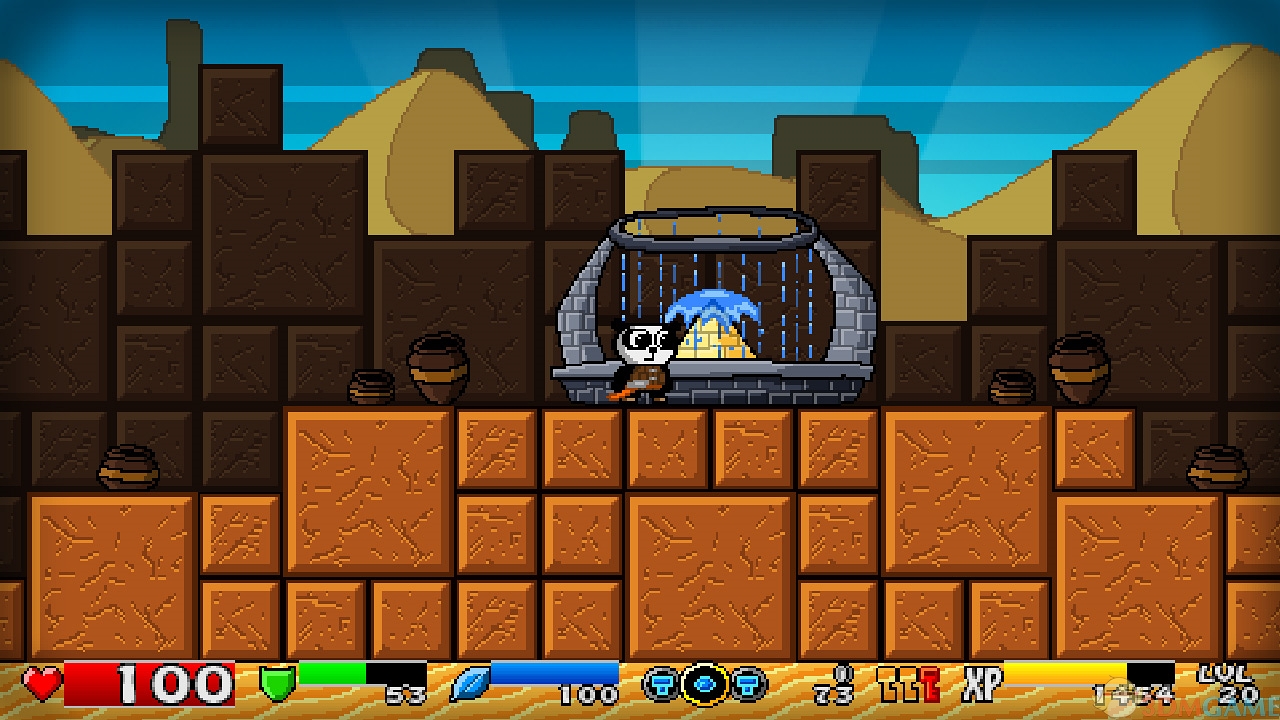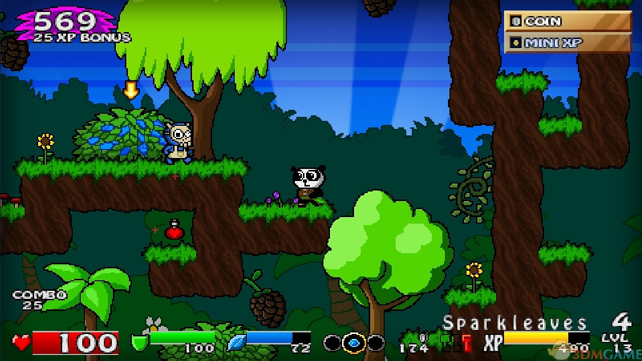游戏采用了横版2D模式呈现,我们将来到一个色彩艳丽的像素世界,主角是一只非常有气质的熊猫,带着一副闪亮的眼镜,看起来十分的酷。本作在画面上的表现可圈可点,虽然是像素画风,但依然保持了精致的细节,远近景物的层次分明,色彩搭配突出主题,将像素冒险内容表现出如此精美的视觉效果,确实也实属难得了。