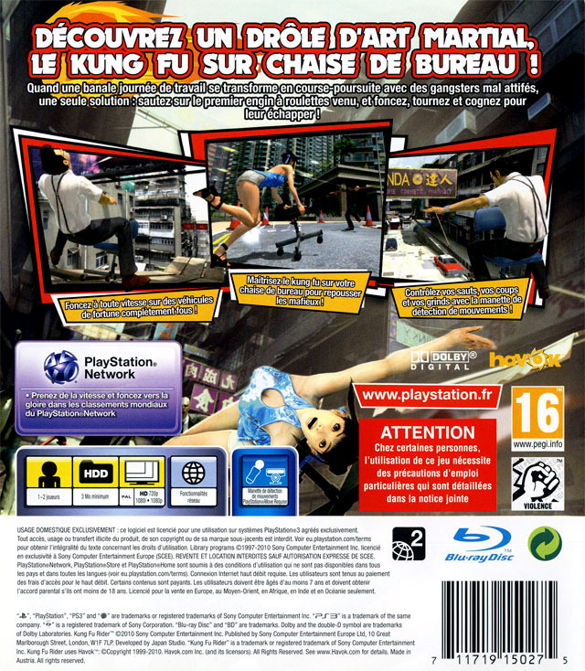 《功夫滑仔(Kung Fu Rider)》是由游戏厂商SCE制作并发行在多平台上的一款动作类游戏,玩家以PS Move手把的甩动让办公椅前进(事实上不只办公椅,还有着多种爆笑的滑轮载具),手把的倾斜控制方向,输入按键指令进行攻击、下腰等动作,操作上虽然有点虚要适应的地方,不过游戏本身的娱乐性非常充足,各种夸张爆笑的演出往往让玩家甚至一旁的观众笑得合不拢嘴!