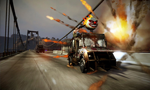 游戏中的过场电影还有角色设定,都会给人一种不舒服的感觉,游戏里的世界极度扭曲,驾驶的汽机车和各种载具都是经过改造的“杀人武器”!跟前几代一样,这代的目标也是挑战“烈火战车大赛(Twisted Metal Tournament)”获得冠军!