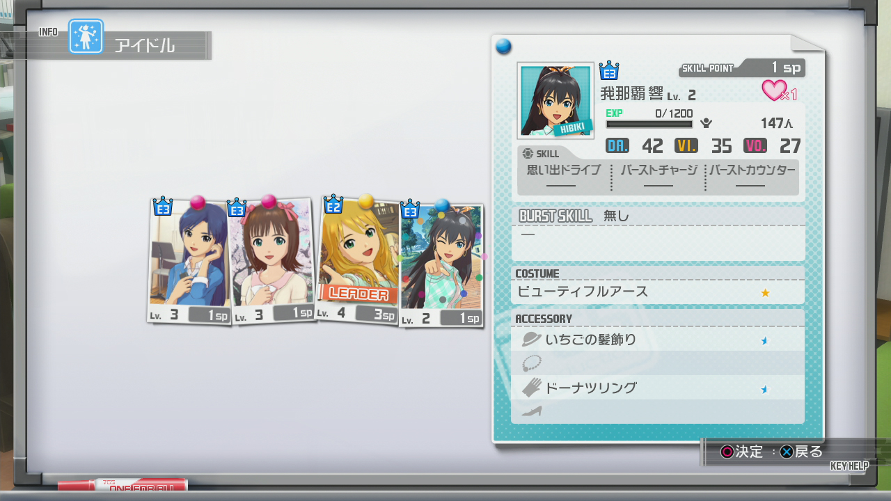 偶像:查看偶像的详细状况、进行服装搭配或学习技能等。
