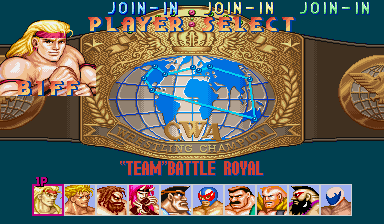 这个是个比较新颖的格斗游戏,共有八位角色可选,比较特殊的地方就可以一个控制两个角色进行四人混合摔角!每个人物都有自己的绝招,大部分都是肌肉男,这个游戏摇招比较容易,但是摇杆和按键容易坏。