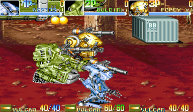 1人《装甲战士(Armored Warriors)》是由游戏厂商CAPCOM制作并发行在多平台上的一款A.STG游戏。游戏的场景设计的很带感,很有战争的味道。敌人设计的也非常有意思,各式各样的炮灰机器人,还有看上去略屌的boss,值得一提的是游戏中最炮灰的敌人,就是人类,他们机会对玩家造成不了伤害,并且玩家能够踩死他们。总之,这款《装甲战士》还是一款非常给力的街机游戏哦。还不来试试?