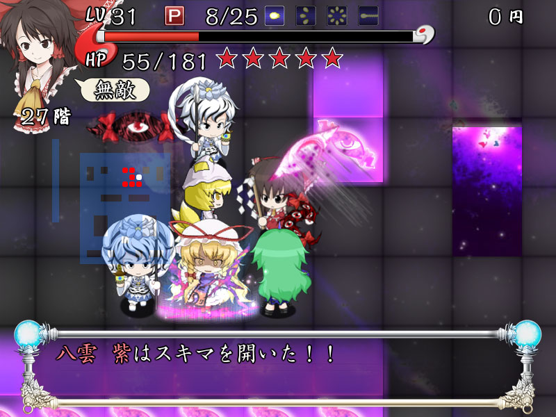2人《更加不可思议的幻想乡》(More!? Mystery Gensokyo plus -The Dungeon of Dreams and Magi)是一款采用了即时制的回合角色扮演游戏。所谓的即时制回合游戏,就是指你在行动的时候敌人也按照与你相同的步数行动,当你不动时,敌人也不动。这种游戏系列是由 CHUNSOFT 创立。CHUNSOFT 就是开发勇者斗恶龙1到5的那家小单位。