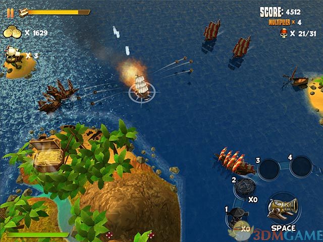 游戏中,玩家需要操控自己的战舰守护画面中央的小岛,保护岛上的财宝,击沉敢来抢劫的海盗,游戏中还会出现一些传说中的大海怪,击杀它们可以获得更高的评分以及金钱。通过升级和关卡的进度,玩家可以给自己的舰船解锁更强力的武器来击退敌人。