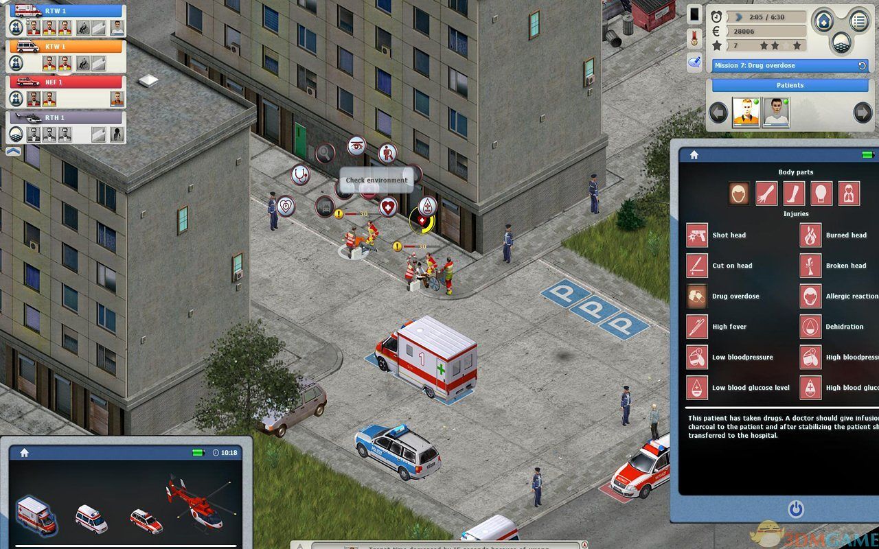 在一个现代化的救护站开始你的职业生涯。协调和指挥车辆和人员,同时监督您的救护站的发展。在你工作一天,你会遇到令人兴奋的和现实的操作场景 - 包括道路交通事故,应急救援和自然灾害,以及简单的救护车调度。在详细的城市地图的帮助下跟踪您的紧急服务队伍。一旦一个团队达到一个紧急的场面,游戏会自动切换到战术视图,它允许你控制你的单位的行动在地面上。由于采用了集成的救援服务指南,您可以准确地检查和治疗的伤亡 - 这要求高度集中和准确的直觉。请记住:分秒必争,拯救生命!