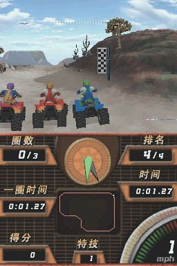简中《山地越野车:极度疯狂(ATV Quad Frenzy)》是由Skyworks Technologies制作Majesco Games发行的一款基于NDS平台的赛车竞速(RAC)游戏。该作是一款非常容易上手的越野车游戏,玩家只需要控制赛车的前进和后退以及方向就可以了。《山地越野车:极度疯狂》在NDS平台上算的上不错的竞速游戏。