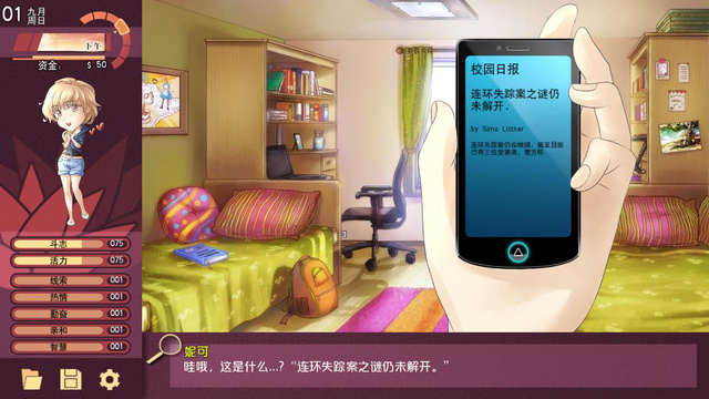 妮可可以在约会中揭开各种谜题。你可以从事兼职工作挣钱,探索不同的地方,做娱乐和课外活动,还可以遇见有趣的角色像达伦,库尔特,杰夫和泰德。你甚至可能去约会凶手!游戏中可以用一个十分简单的应用界面,选择每天想要进行的活,提高妮可的能力,让她的士气和能量持平。否则她将无法很好地完成日常任务。游戏特设置四个男性的浪漫的选择和一个额外的四个女性浪漫选择会在几个月后的另一个版本中发布。你可能只专注于约会,或者收集足够的证据解决谜题并解锁一个针对每个约会对象的额外结局~~(那个女主的立绘,要没有她的胸,我都以为是个帅小伙子!)