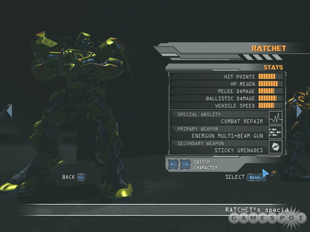 角色可自由选择 , 玩家可以依自己的喜好,选择最喜爱的角色,不管是博派还是狂派都可以。可以选择的有上一集电影中的人物,当然也有新角色。而根据玩家所属的阵营,要保护人类或者是消灭他们的游戏目的也会有所不同。
