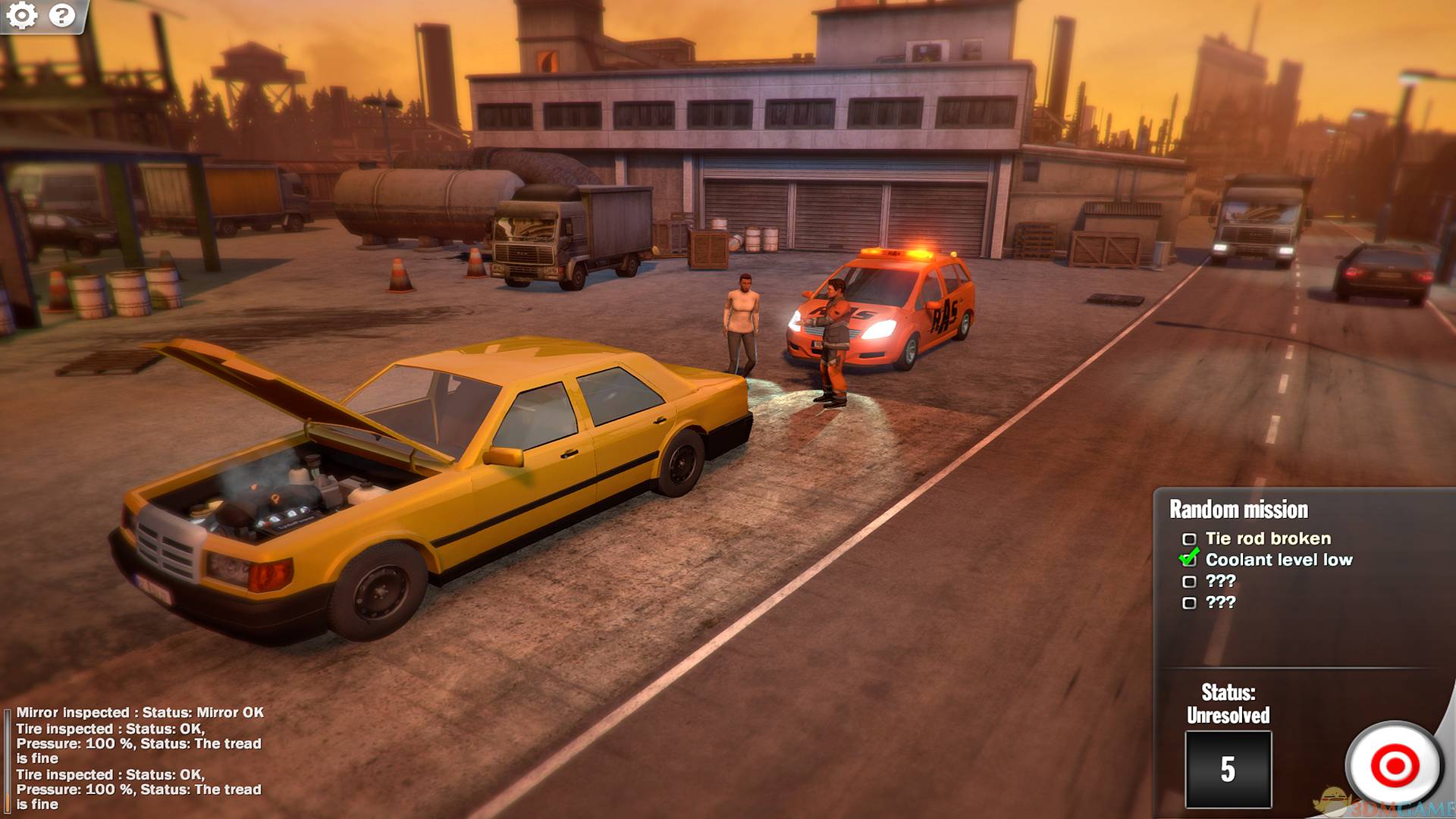 2、现场任务是需要玩家自己去现场进行故障的派出,在电话按钮那里可以打开现场任务,需要一条一条做,不能跳跃,进入现场后,玩家需要和车主进行对话,了解车子的信息进行解决,完成后会获得评分。