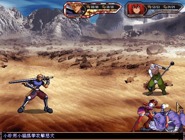 在确定主角的战斗指令后,下一回合便会依照这个指令或是攻击敌人,或是防卫我方的伙伴,甚至还有人工智能作战系统,因此如果战术运用得当,就可坐在椅子上欣赏战斗演出。画面中主角队伍与人物采用近似真人比例造型,配色鲜明,还加有人物独特的小动作。