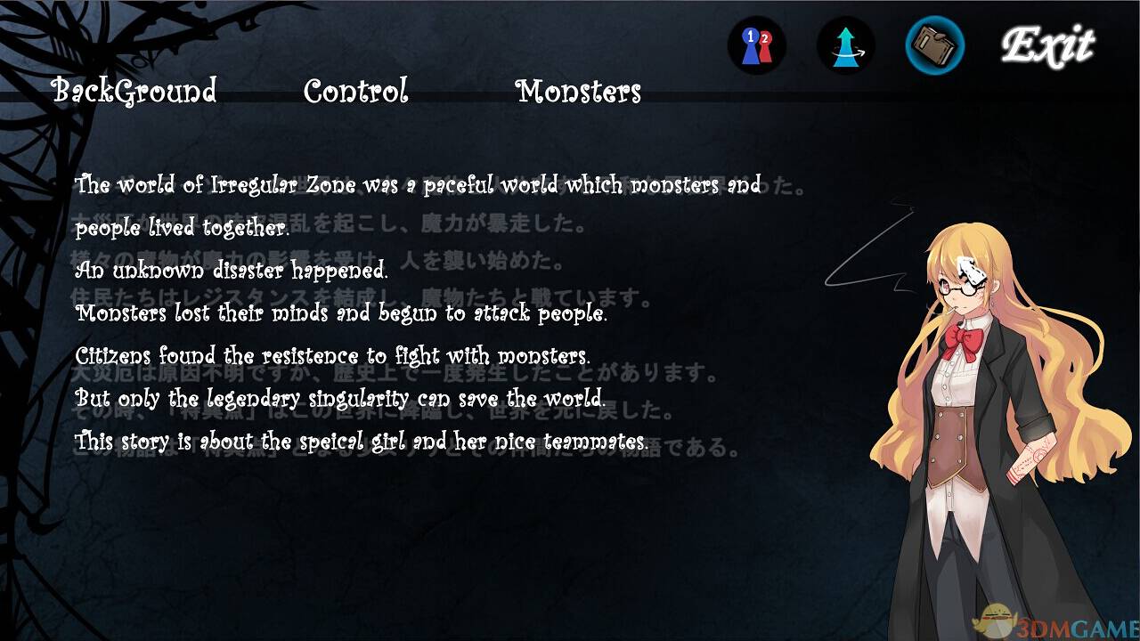 1人《不规则区》是一款日系美少女风格的RPG游戏,这是一个混合式的游戏,包含文本的冒险和RTS元素游戏。背景是发生在一个叫做不规则区的世界。在那里原本人类与怪兽和谐共处,但某一天未知的灾难发生了,怪兽失去理智开始攻击人类,人类发现只有传说中的奇异性才可以抵挡怪兽拯救世界。本作讲述的便是一个叫Lily的女孩成为奇异性,她用魔法创造出忠实的队友和怪兽对抗的故事。