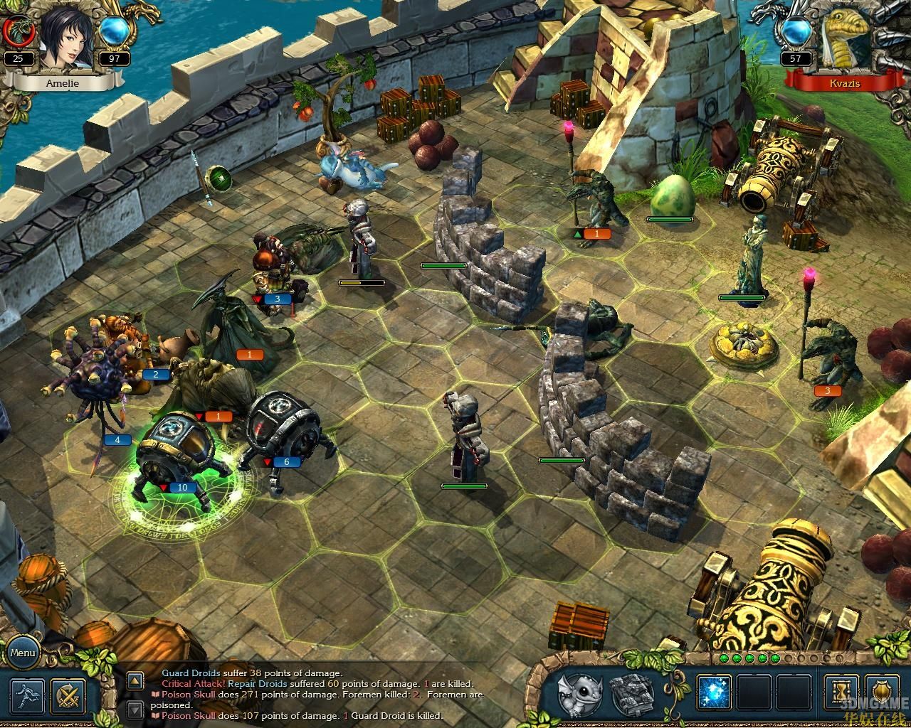 战斗方式类似与英雄无敌的回合制战棋游戏,每个兵种都有其独特的技能和特性。还能施放各种法术或卷轴。Amelie还有宠物龙,可以寻找宝物、攻击敌人和召唤生物等。战斗中还会有各种各样的机关。
