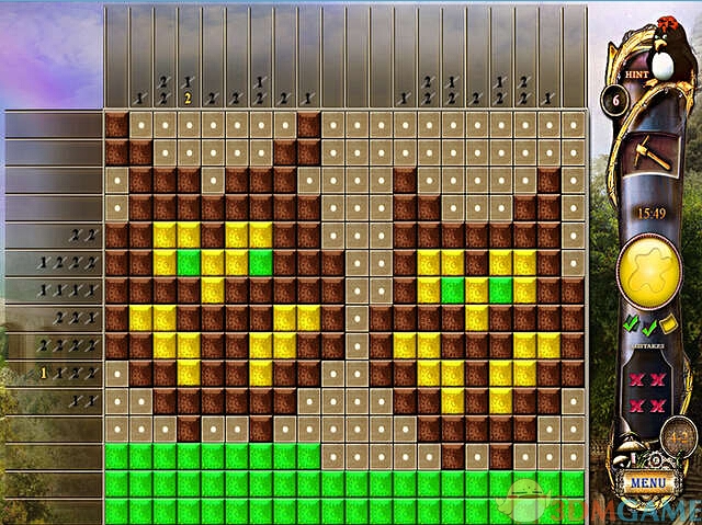 数图游戏是由方格区和方格区之外的数字组成,每一行方格的前面以及每一列方格的上面都会存在一些数字,这些数字代表着当前行或者列中所要填充的方块数量,比如某一行前面存在2和1两个数字,那么这一行应该要填充三个方块,并且会有两个连续的方块在一起,两个连续方块应该填充在左面(不一定),空一个方格或者多个方格之后才能填充单独一个方块。如果某一列上面依次存在5和4和2共三个数字,那么该列从上至下的方格填充区需要填充十一个方块,其中五个连续的方块填充于偏上位置,至少空一个方格之后填充偏中位置的四个连续方块,再至少空一个方格之后填充偏下位置的连续两个方块,注意前面所讲到的空方格,这个所要空出来的方格数量是推理出来的并不绝对是一个方格,有可能是两个,有可能是三个,或者是更多。如果玩家已经确定了某个方格一定是空的,那么你可以用鼠标右键点击一次该方格,那么就可以做出白色圆点的标记。