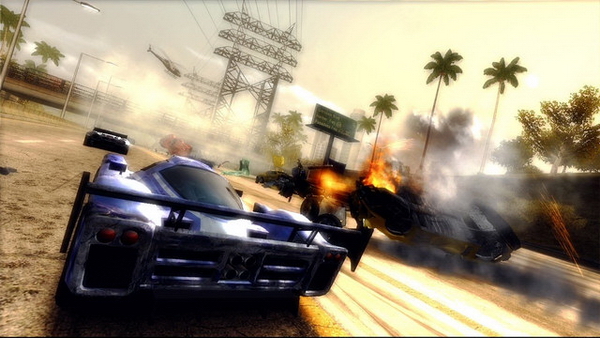 虽然《复仇》只是《火爆狂飙3》的强化版而已,但借助自家RenderWare引擎的强大威力,游戏的画面和光影效果还是有了相当程度的强化。车体的建模和赛道沿途的场景细节都有了明显的进步。而在《火爆狂飙3》当中进行慢镜头回放时出现的掉祯和拖慢等现象也有了改善。当然,系列最受欢迎的卖点-“撞击”的场面也是同样非常出彩。在高速行驶的冲撞过程中,车辆翻侧后与地面摩擦出现的火花,玻璃碎片和零件残骸散落一地的场面依旧触目惊心,刺激之余还有一股心有余悸的感觉。确实是爽呆了。在赛道的设计上,地形和路面情况的复杂度也丰富了许多。虽然不少场景是前作的改造版,但针对对手的野蛮缠斗和阴险的垂直压制,还有紧紧咬住味方的爆炸性的追撞爆破等错综复杂的情况,设计小组精心设计出了连环车祸场面的广阔的追撞路线,设计出多层次的跑道。由于道路里面往往设置了很多千奇百怪的跳台,而地点又恰恰都是一些非常险恶的瓶颈点。让游戏的进程充满了变数,也是游戏的节奏变得更紧凑和瞬息万变了。不过,游戏还是出现了不少的贴图错误,而且,游戏的LOADING时间和频率也显得过长和过于频繁了,这不能不说是一些美中不足的情况。