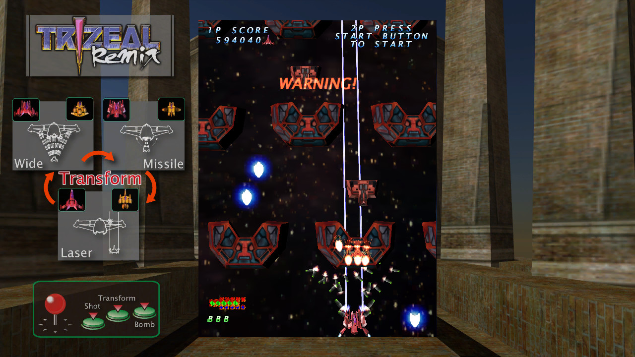 游戏中玩者操控自机『ANTARES-1(1P)』,使用射击和炸弹攻击敌人。射击方式主要有分〔广范围方能型WIDE(散弹)〕、〔火力诱导型MISSILE(导弹)〕、〔集中贯穿型LASER(雷射)〕等三种,玩者您能因时因地随心所欲地切换,以符合各种不同的攻略需求再杀出一条活路出来!且除了前方攻击之外,某一架特别的机体还导入了「侧面攻击」的概念,您只要依序按下方向按钮或摇动左操作桿,就能向左、向右或同时攻击左右两方的敌人!体验全方位的攻击快感!