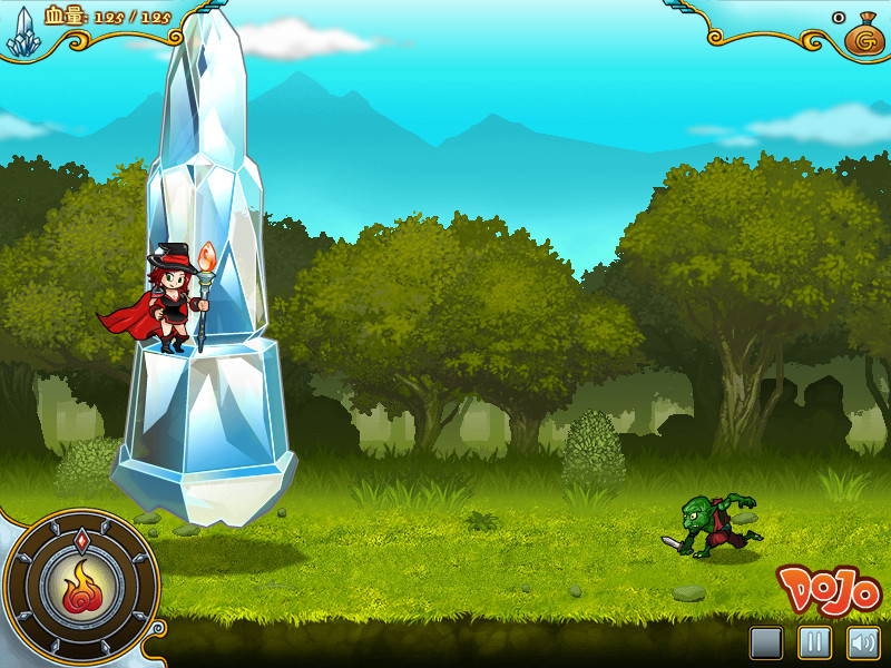 进入游戏后,玩家需要面对成群结队的绿魔怪,越到后期,关卡数量就会越多,当然,你也会面多更多种类的怪物,天上飞的,地上跑的,不合理使用技能的话很容易被消灭。Q、W、E分别代表女巫的三种技能:火、冰、雷电,因为三种技能之间并没有CD时间,所以可以循环使用。