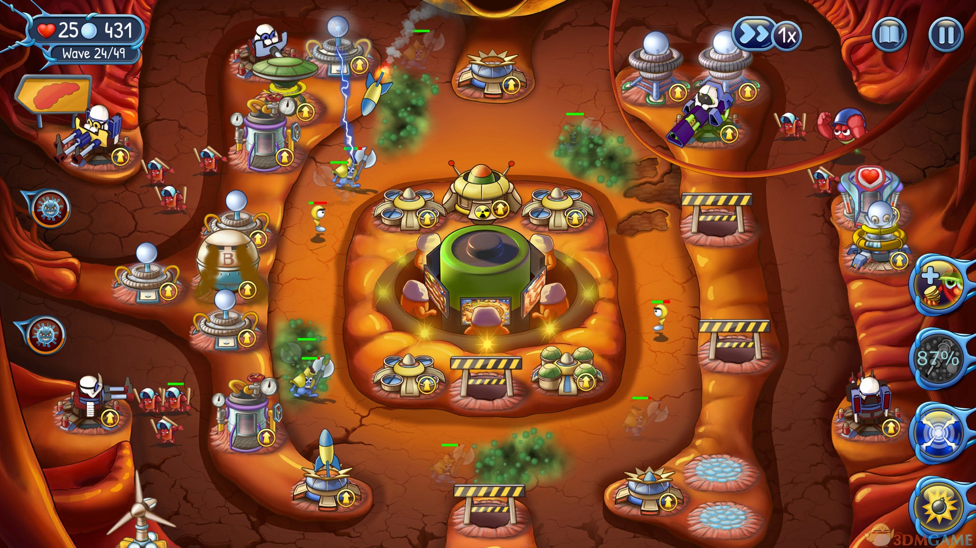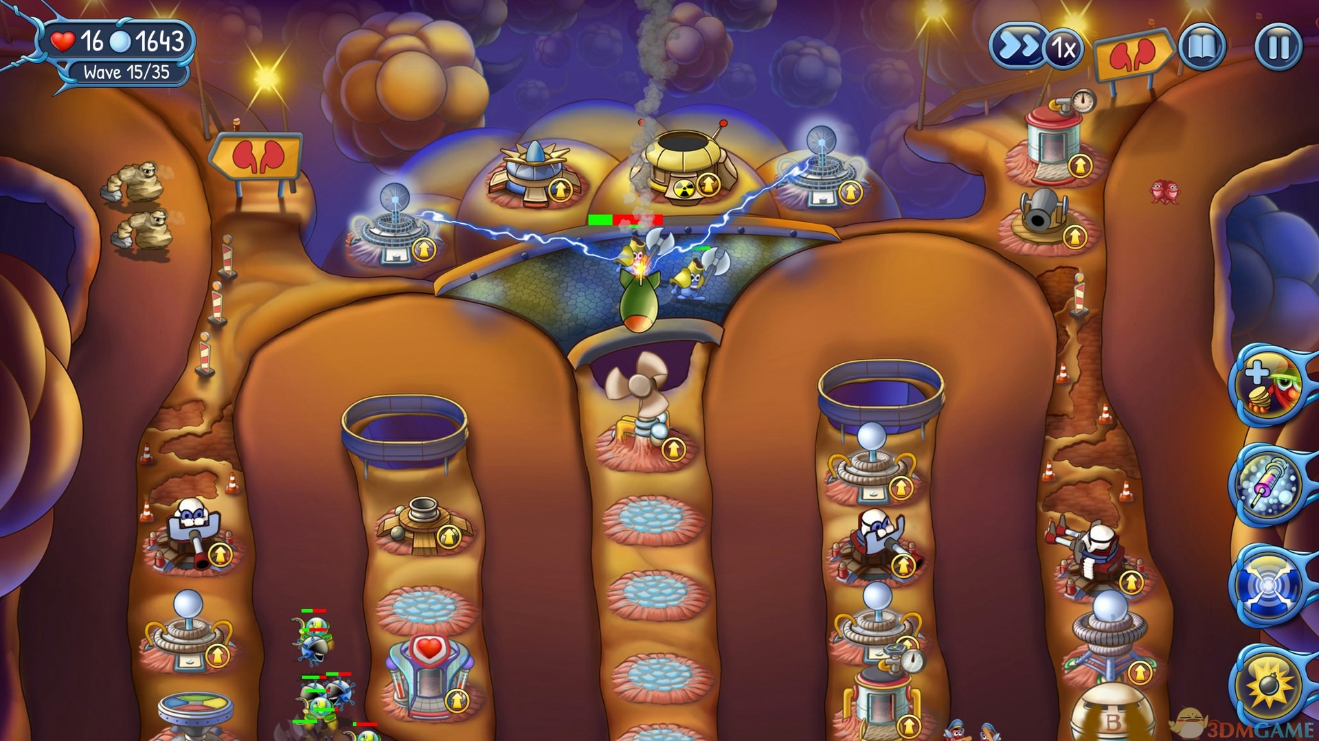 游戏中总共有四个不同的防御塔,分别是血球塔、血小板兵营、轰击塔、以及维生素工厂。
