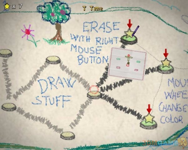 游戏的画面风格十分特别,令人一见难忘,昏黄的草纸背景,搭配五颜六色的蜡笔线条,在简单之中透露出另类和别致。游戏的动画流畅,配合真实的物理模拟引擎,显示出了制作者高超的水平。