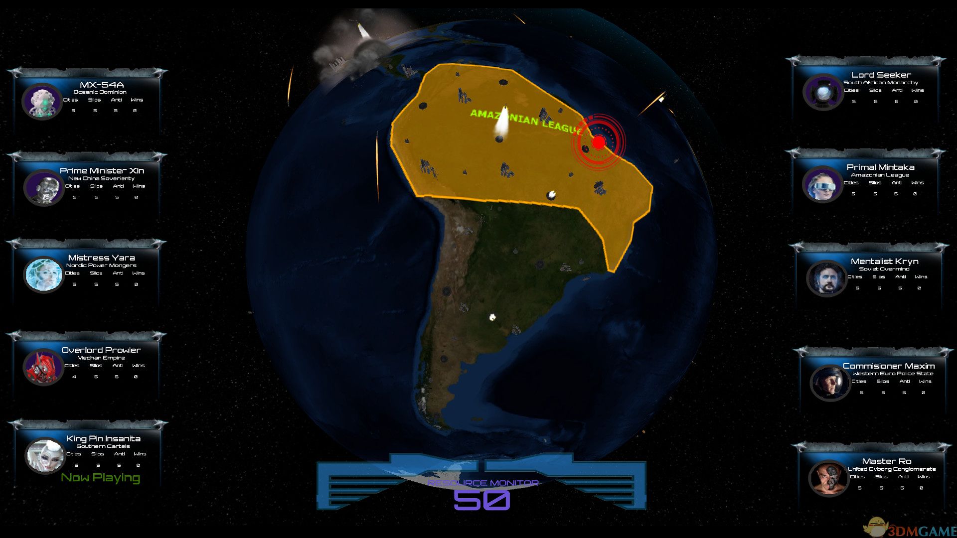 本作剧情设定大胆,以第三次世界大战为背景,机器人占据了大量土地,一些地区人类已无法居住,所以资源就变得尤为重要,一场为了争夺资源的战争也就拉开战幕了,在这场战争中,玩家需要通过控制导弹来攻击对手,从而抢夺资源,然而对手可不会坐以待毙,玩家在游戏中将会面对9个不同的对手,压力还是很大的,到底谁会获得最终胜利呢,让我们拭目以待。