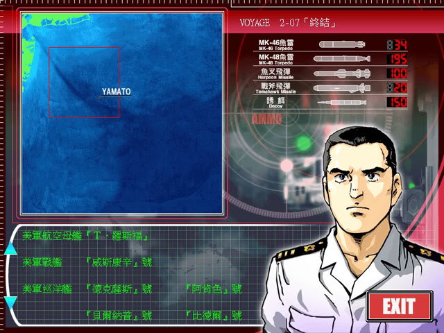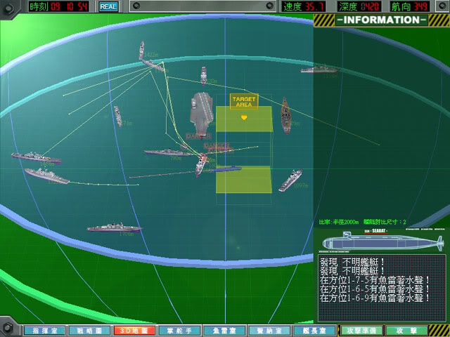 声纳室:声纳中心点时本舰,周围出现其他小点表示有目标接近,用鼠标点击小点会显示该目标信息, 目标越接近信息越多。ACTIVE SONAR主动声纳,主动探测敌人所在,以便攻击,但开启后亦会被敌人发现。