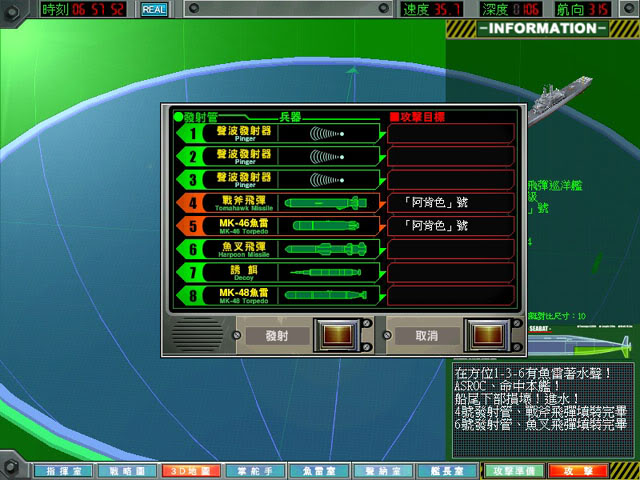 鱼雷室:指令比较简单,装填、排出鱼雷。因为装填需要一定时间,鱼雷发射后要及时重新装填,以免错过攻击时机。