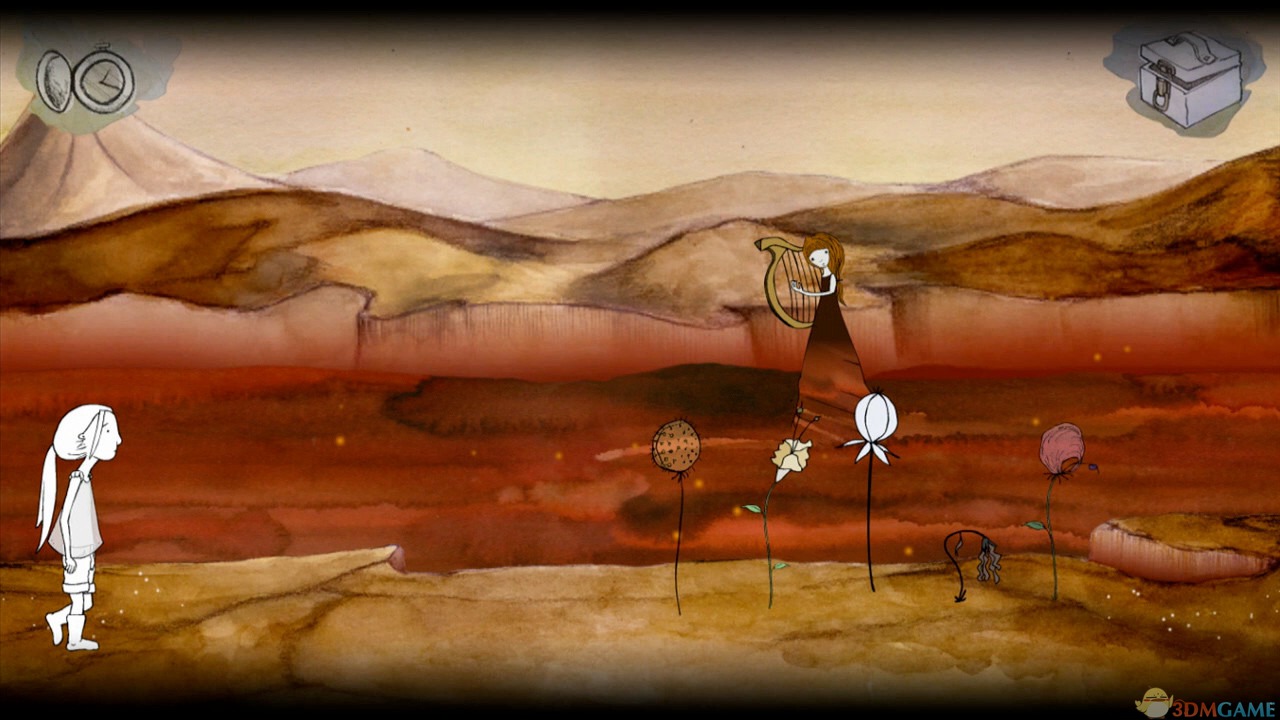 观察琴女,看到她在弹琴。与琴女对话,得知这五朵花可以奏曲,并形成通往对岸的桥。点击这四朵花,听到声音并看到它们可以形成台阶。用半杯水浇灌第四朵花,但是花很快枯萎了,所以河流里的水无法让花重生。继续跟随风的方向走,到蜘蛛洞。