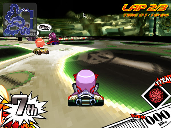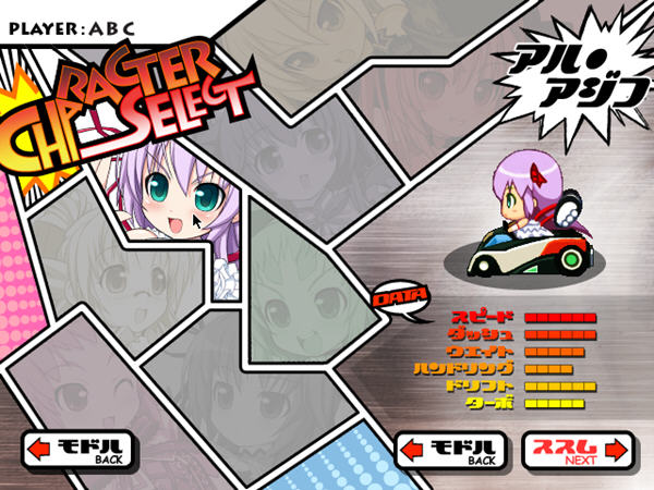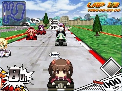 0人机神飞翔中女主角们的竞速,有点像卡丁车, 除了那令人熟悉的游戏方式,当然也有各种的武器。游戏方式比较类似跑跑卡丁车。都是一样的Q版捡道具攻击前面的队友的赛车游戏。只是把主角都换成了机神飞翔中的妹子们。