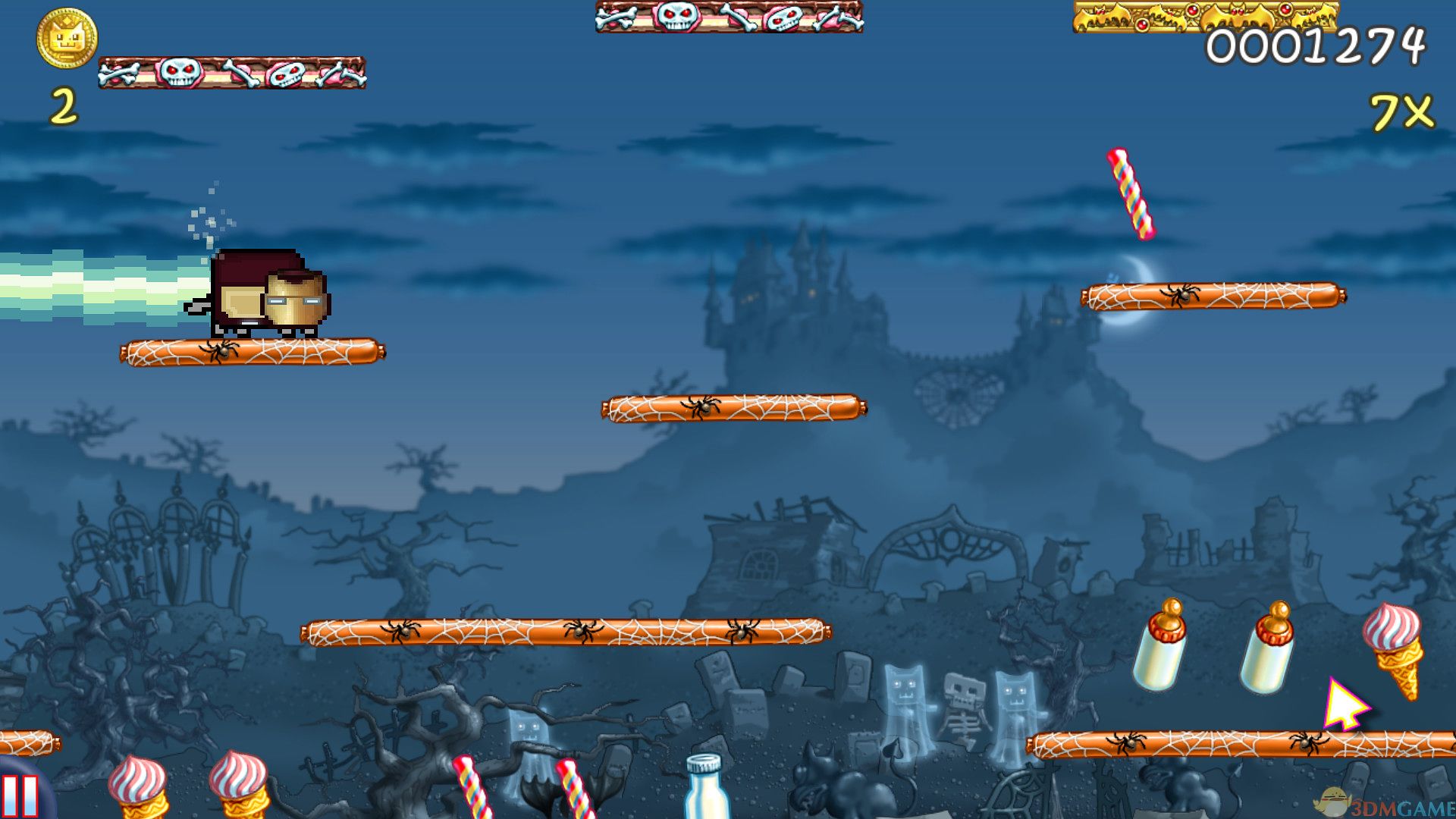 《彩虹猫:迷失太空》有着欢快有趣的形象和动作,并且带着2D像素风格的画面。配合上那首从头到尾都是“Nyan”的曲子,绝对是洗脑度十足。游戏的操作是简单直观的触屏形式,单击屏幕跳跃,双击可以二连跳。获得火箭超人等道具可以飞行的时候,直接按住屏幕然后移动自己的手指是控制飞行方向。玩的时候我们要做的就是不断的去收集各种蛋糕、牛奶、点心糖果,并且避开黑猫、飞碟、狗狗等等危险的家伙。