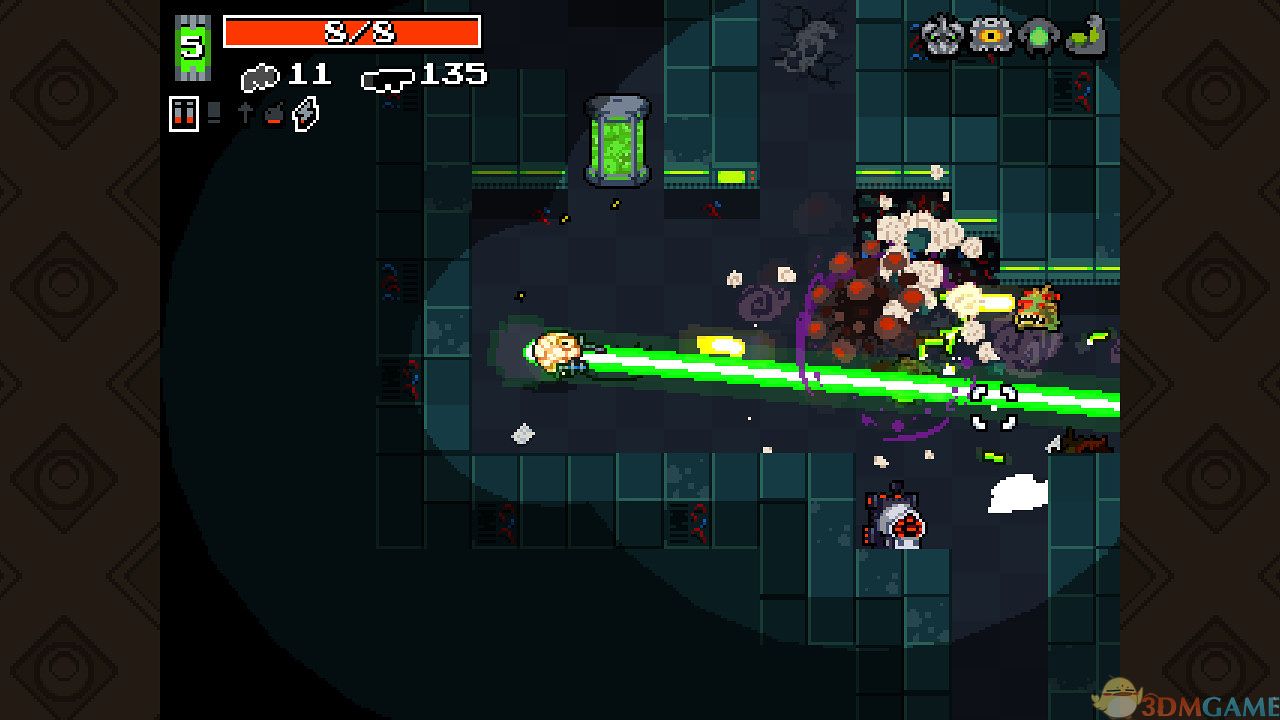每次游戏都是随机生成的场地,消灭变异体获取经验(绿色晶体)和补给(弹药或者血瓶),升级后会在下一关开始前让玩家选择一个方向强化角色,可以强化的有血量、武器威力等等。角色可以同时装备两个武器,枪械类武器的子弹数量是有限的,子弹打完了就切换副武器吧。场景中红色宝箱可以开出武器,包括锤子、刀、镭射枪等等。