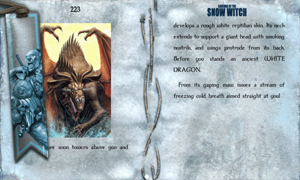 《雪女巫的洞穴(Caverns of the Snow Witch)》游戏根据 Ian Livingstone 1984年所创作的同名小说改编,讲述瞭玩家所扮演的守卫士兵在被冰封的亚洲大陆与邪恶的雪女巫对抗的故事。玩家要从第1个章节开始,并通过各种选择和角色判定,想办法走到胜利的章节。既然是战斗幻想系列,游戏自然少不瞭战斗。游戏中会有雪女巫安排的各种怪兽和战士阻挠玩家,玩家需要为主人公的技能或运气做出判定:扔两枚骰子,并比较扔出的值和当前技能或运气的值,来对敌人造成伤害。