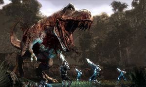 本作一个十分有趣的地方是将怪物融入到游戏之中。环境和恐龙将会成为你利用的工具,敌人将会变为你的武器。你会看到如何用T-Rex击倒巨大的敌人。战略性的利用怪物和环境是在本作中克敌制胜的重要方式。