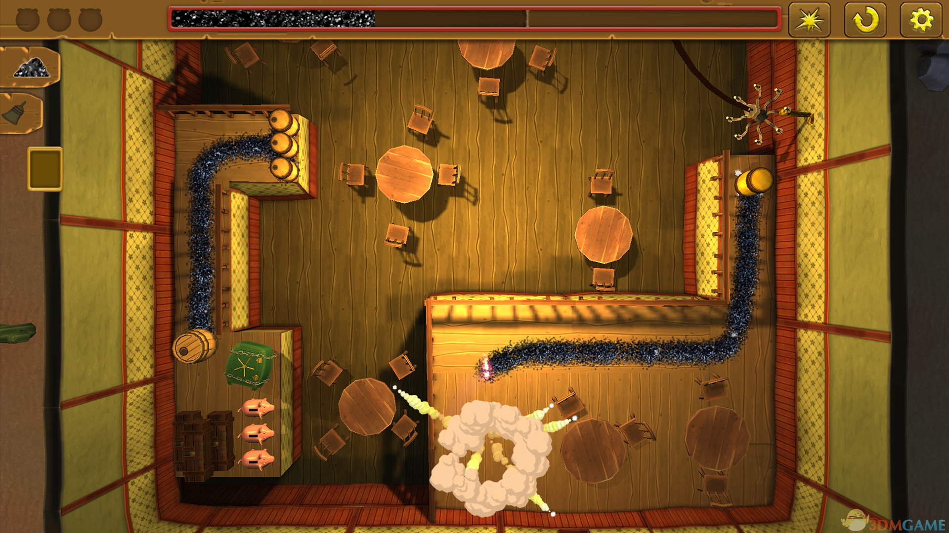 在玩法方面,《火药(Gunpowder)》更像是一款连线游戏。每个关卡中都有一个火堆和一个被锁住的宝箱,玩家需要利用手指滑动屏幕将火药铺在地上,以此连接火堆和宝箱,将其炸毁。要注意的是每个关卡给出的火药数量有限(在屏幕上方提示),并且游戏中除了宝箱之外还有小猪存钱罐,玩家必须高效布置火药,在过关的前提下获取更多的存钱罐。如果你在铺设过程中不小心出错,也可以利用扫把工具重新回收。当然,前提是不能引燃这些火药,所以建议玩家从宝箱处开始放置火药。
