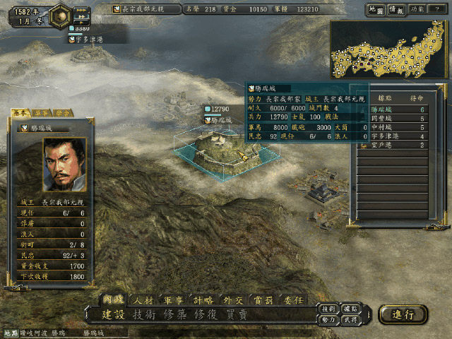 在内政与建设方面,本代使用了与前作相同的城下町自由建设系统,可在各城镇的领地自行建设各种不同功能的聚落或设施,像是农村、武家町、职人町等7种町,以及商馆、兵舍、学舍、工房、城寨...等27种不同的设施,让领地逐渐的成长茁壮。之外并加入了能发展各种军事与内政技术的“技术革新”系统,总共有80种以上的技术可供研发,像是可以富国的内政技术,影响战争型态甚钜的铁炮(火枪)技术,强化城堡防御力的筑城技术,掌握海权争霸的水军(海军)技术等。