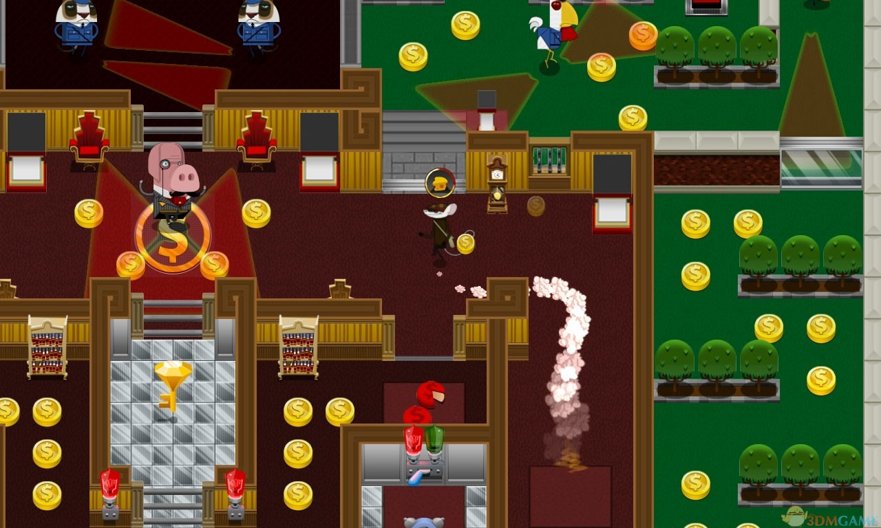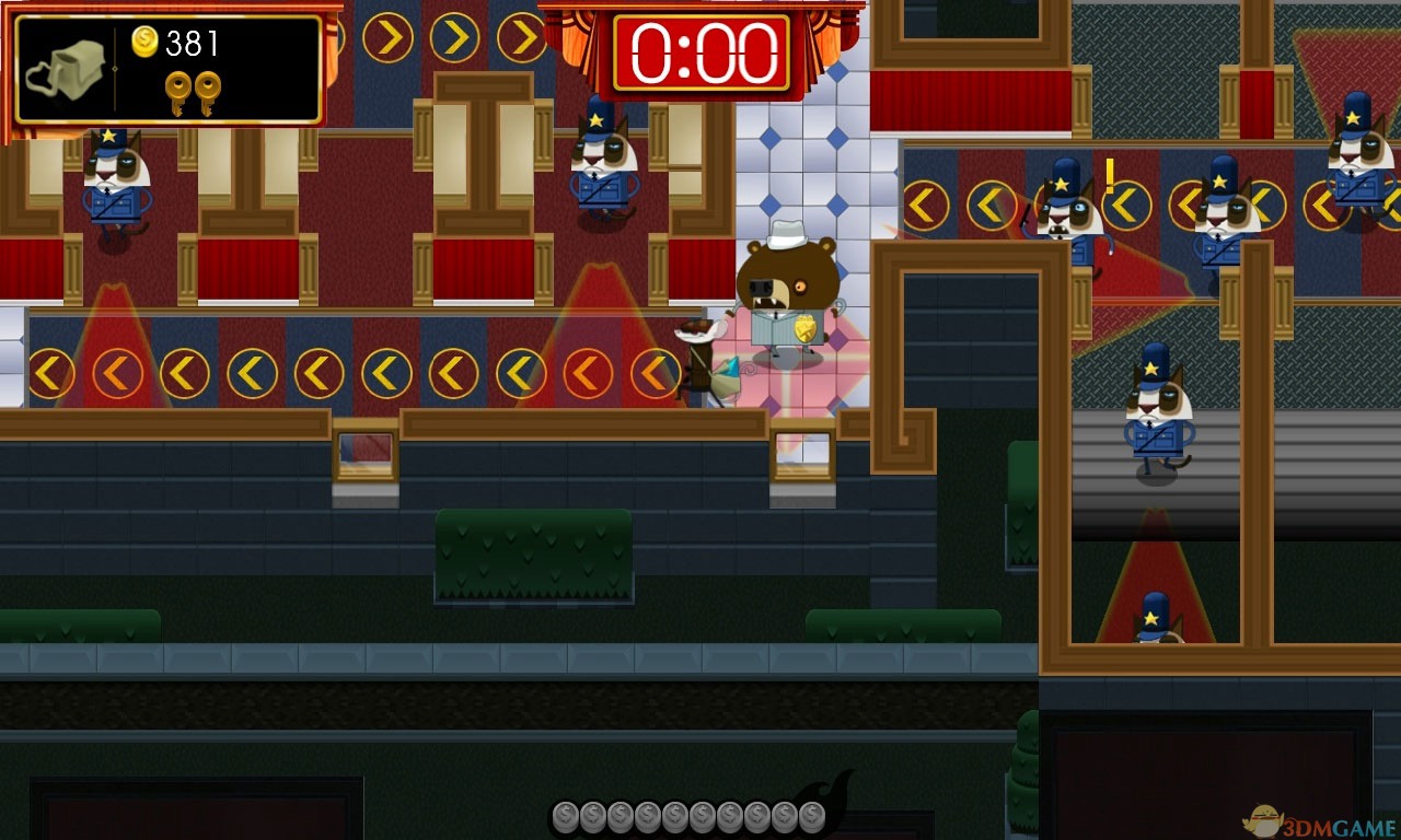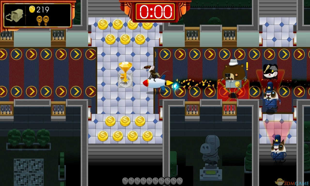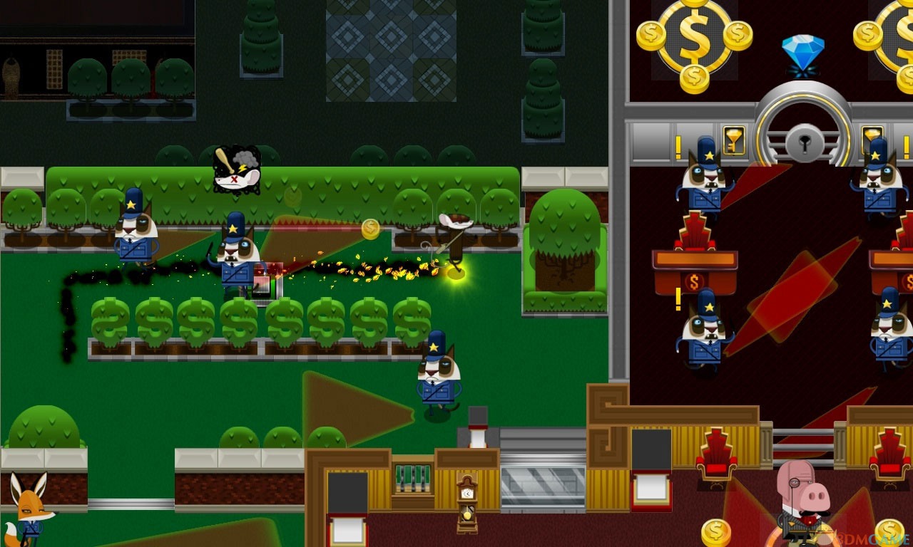 《大盗鼠:时不我待(Rats:Time is running out)》是由Citeremis Inc.制作的一款动作冒险游戏。并采用了快节奏的玩法。游戏中玩家要控制主人公潜入银行,并躲开巡逻的猫科动物、狐狸等守卫,从而收集金币和钻石。体验一个银行抢劫犯的刺激生活!偷偷进来,抢钻石,避开守卫,在时间用完之前顺利逃出。你的使命,就是从那些猪身上取回银行的控制权。《大盗鼠:时不我待》将创造一种吃豆人的速度,你需要专注、快速和策略,以获得成功,最后你会获得更大的奖励。