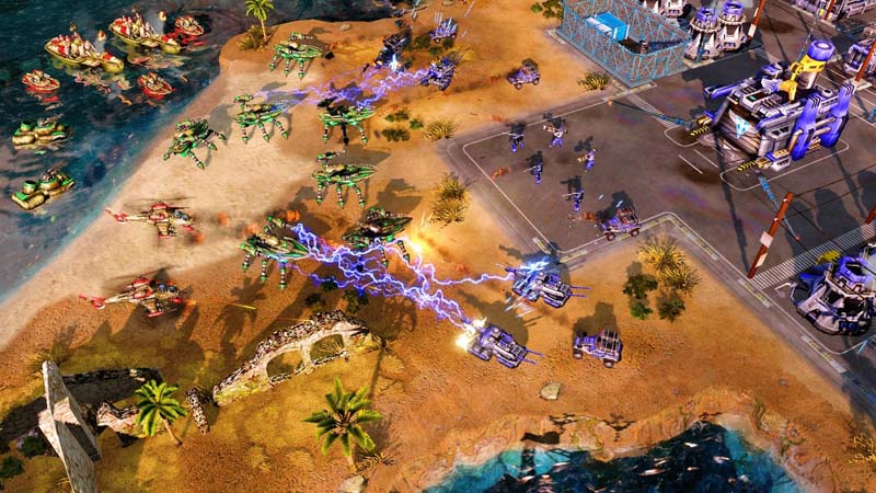 玩家需通过建造基地、制造部队、升级科技、采集资源等方式与其他玩家或AI对抗。不同阵营有独特的建筑和单位,如盟军可将建筑直接放置,俄军需先选地点再建造,旭日帝国则通过纳米核心展开建筑。