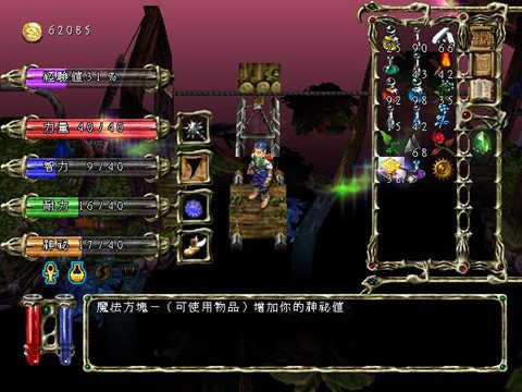 在游戏进行过程中会影响到人物的属性。随着马文人格的逐渐发展,奇妙的魔法效果和超炫的动作会让你完全的进入一个超乎想象绚烂美丽的奇妙世界。 游戏特色全3D制作 游戏画面采俯瞰视角,360度旋转画面观看,场景设计极精致绚烂生动剧情 整个探索故事极具挑战性,剧情与游戏进行紧密的结合八个关卡 八个不同的世界,每个世界的场景、人物都有极为细致的图画描写。诡异魔法 绚烂壮观的施法场景游戏变化 游戏中有白天、夜晚的变化,天气也会随时改变立体配音 游戏全程真人配音,随着游戏天气变化的声音效果极佳背景音乐 超过60种的背景音乐过场动画 感人肺腑的游戏过场电影,出现在每个关卡的初始容易存取 操作简单、容易上手,并提供游戏进度储存功能,不须重头来!