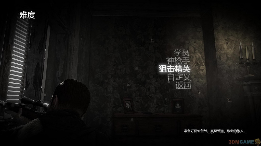 游戏难度有军校学员、神射手和狙击精英三种难度,每一种难度通关后可以获得相应的成就。