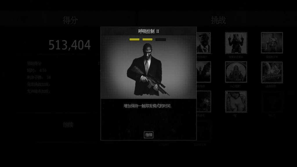2、每过一关收集武器配件,用来组装新武器,新武器会有更快的射击速度,稳定性,弹夹容量,升级武器还有各种技能,比如最简单的屏息什么的,其他技能我没记住,不过种类很多,但好像不能自己搭配。