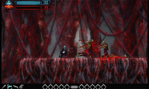 该作讲述了一个非常俗套的故事:游戏主角是一位强力刺客,他的老婆被人绑架,So……整个故事的主线就是英雄救美。虽然剧情老套,不过玩法与画面却兼顾新鲜与怀旧,颇有科幻恶魔城的味道。