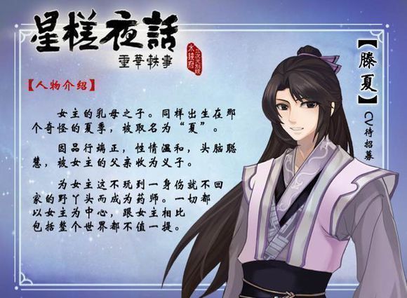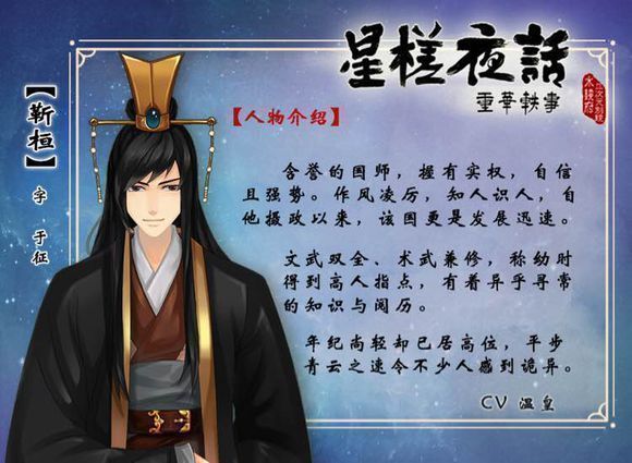《星槎夜话之重华轶事》是由水镜府三次元别院制作的一款乙女向文字游戏,游戏类型属于古代架空历史的幻想妖异志,可攻略人物仅限男性(无百合结局),攻略类型含普通、隐藏、解锁三种。剧情采用多重分支模式,情节纵横交错,结局也相应的非常多,与之相应,会在游戏内提供简略流程图以方便玩家~