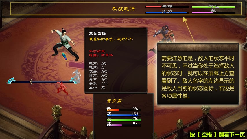 身法:决定人物的闪避率和逃跑成功率,并在一定程度上影响人物的内功防御力