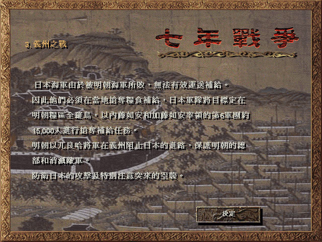繁中时空背景架构于明朝高丽半岛的《七年战争》,是以中日韩三国的冲突为主题,刻画这一段中日两国第一次正面对决的史事。这次玩者可以试图去改变历史,看是要扮演日本倭寇军还是中华大军都可,而玩者是否能以最少的代价赢得最后的胜利,就看玩者的谋略了。