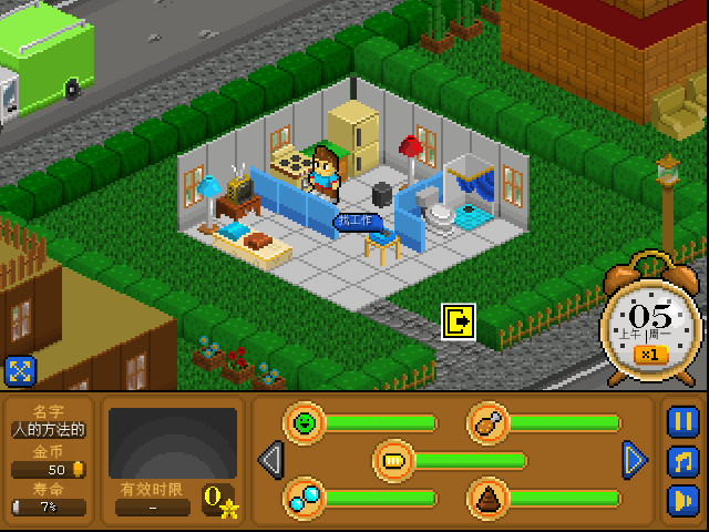 角色生存属性五个,幸福、饥饿、精力、卫生、膀胱,都是会随着时间自动减少,别问我用光了会怎么样,反正肯定不会有好事;