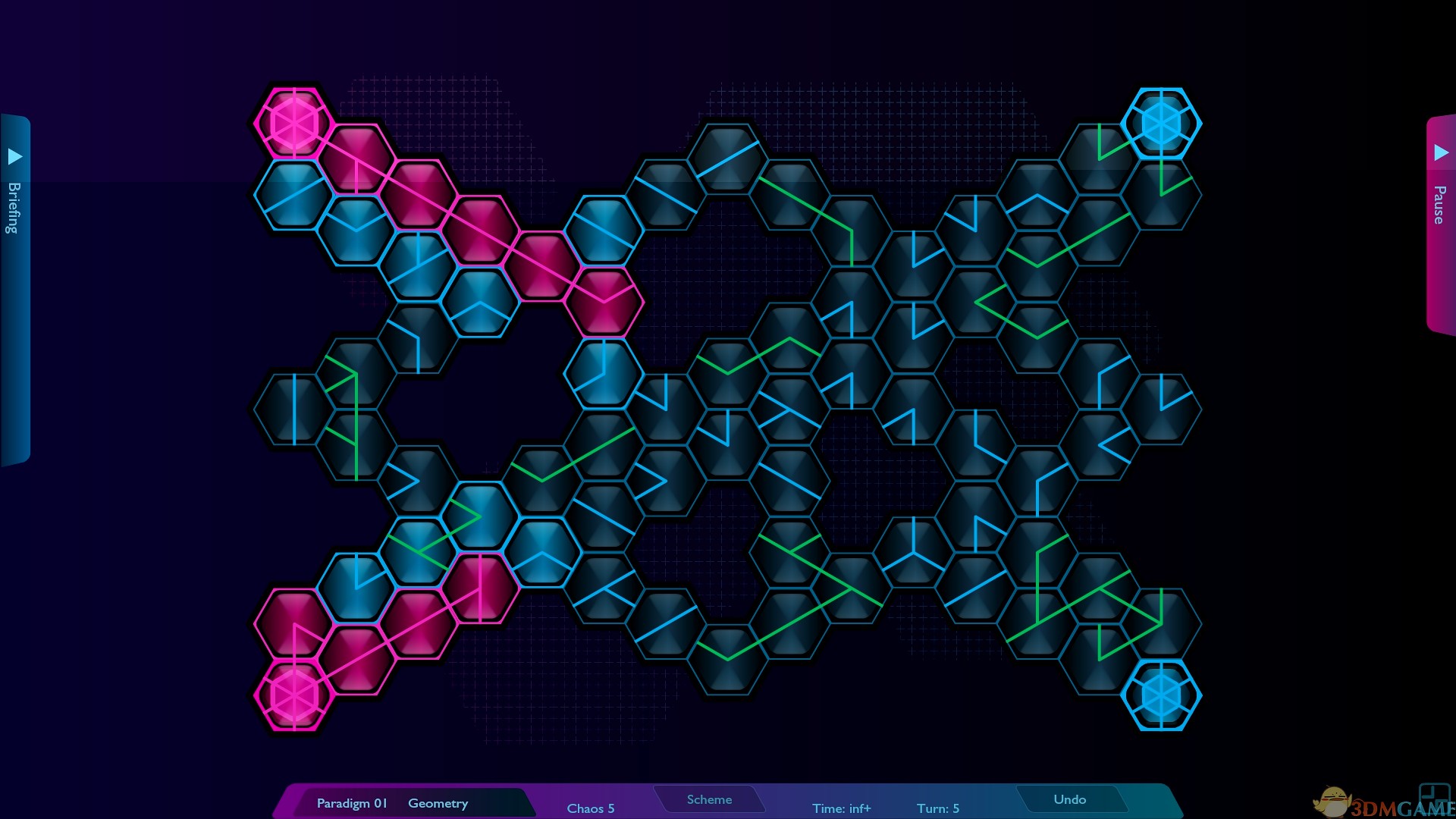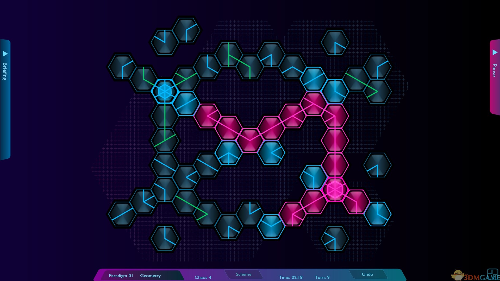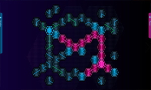 游戏的玩法类似接水管,它里面安排了一大波散乱的六边形路径芯片,只等玩家从里面挑出有用的芯片进行替换,使得紫色的发射器,最终能顺着路径将电输送到电流接收器那里。