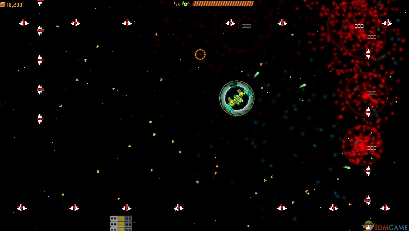 总共20关,过15关即可拿到奖杯。一开始有5条命,每过一关能买一个装备。从左到右分别是防护罩,炸弹,副机,主机,生命。